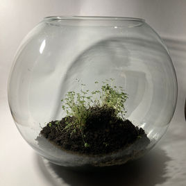 Durante este proceso de cuidados llegó un punto donde los brotes rebosaban sobre la piedra tejida y mi colega y también artista visual Ivonne* me recomendó pensar en un sustrato para que las plantas pudiesen continuar su crecimiento y nutrirse. Fue así que el proyecto pasó a su siguiente fase donde sobre una cama de tierra de hoja dentro de una burbuja de cristal y no fue sino hasta que un día el exceso de agua en un riego comenzó a formar un agujero en el centro de la piedra y posteriormente el riego irregular aunado a la falta de sustrato en la parte central dieron pie a la descomposición paulatina de los brotes. La constancia es crucial para la formación de vínculos así como para la continuidad de la vida.